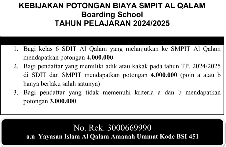 Kebijakan Potongan Biaya SMPIT Al Qalam Boarding School Tahun Pelajaran 2024/2025