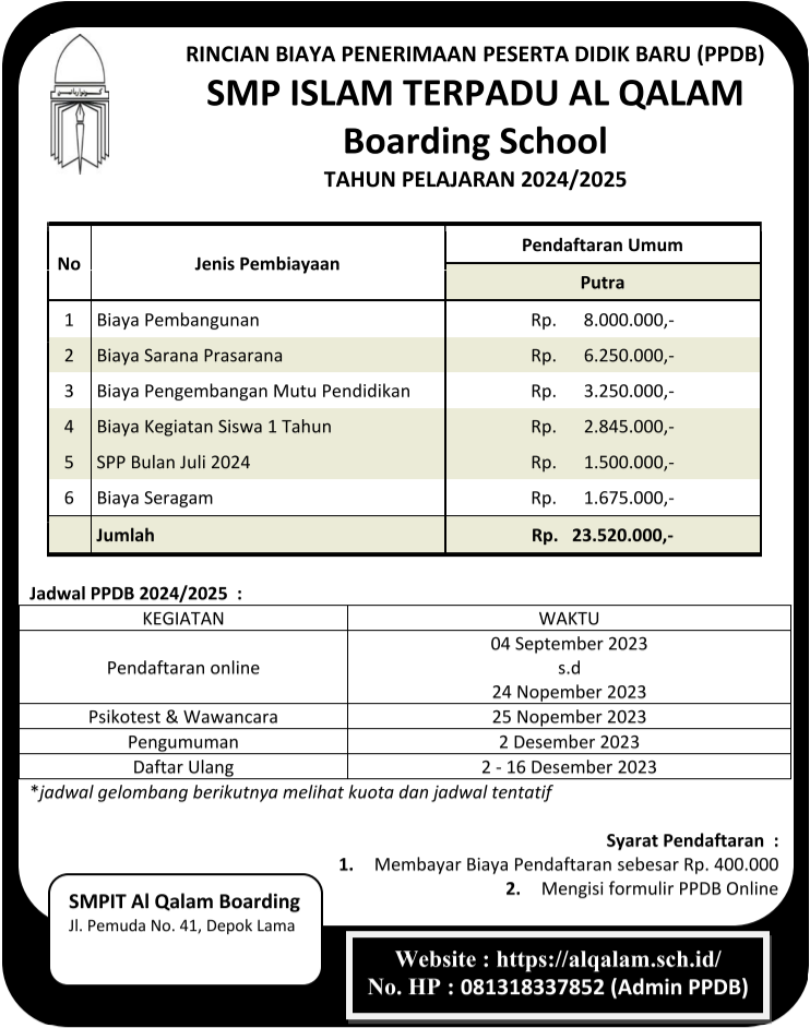 Rincian Biaya Penerimaan Peserta Didik Baru (PPDB) SMP Islam Terpadu Al Qalam Boarding School Tahun Pelajaran 2024/2025